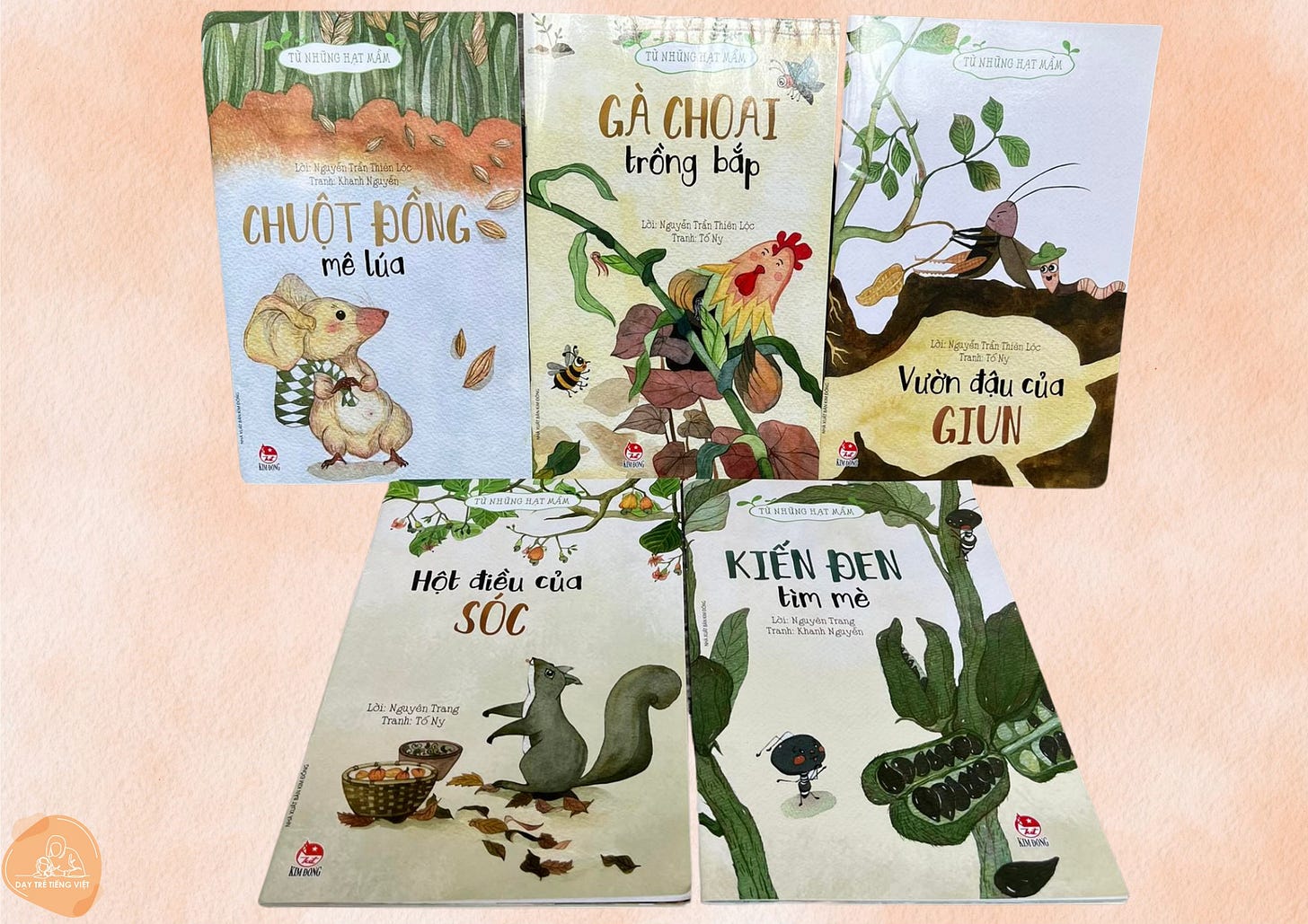 Bạn không nên bỏ qua bộ sách “Từ những hạt mầm” này. Bộ gồm 5 cuốn truyện thơ Kiến đen tìm mồi, Chuột đồng mê lúa, Vườn đậu của giun, Gà choai trồng bắp, Hột điều của sóc.