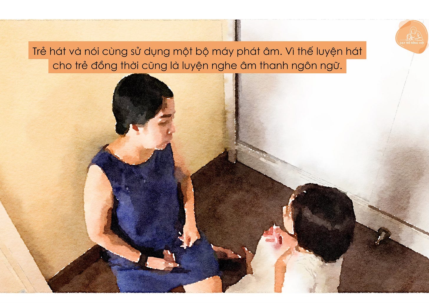 Trẻ hát và nói cùng sử dụng một bộ máy phát âm. Vì thế luyện hát cho trẻ đồng thời cũng là luyên âm thanh ngôn ngữ. Dạy trẻ hát tức là rèn luyện cho trẻ khả năng điều khiển bộ máy phát âm của mình. Giúp trẻ có cơ hội “đối đáp” lại với bạn. Vì lúc này trẻ chưa có khả năng nói thành từ, câu hoàn chỉnh thì nhờ những giai điệu của bài hát, trẻ sẽ thêm phấn khích và tăng thêm tương tác với cha mẹ.