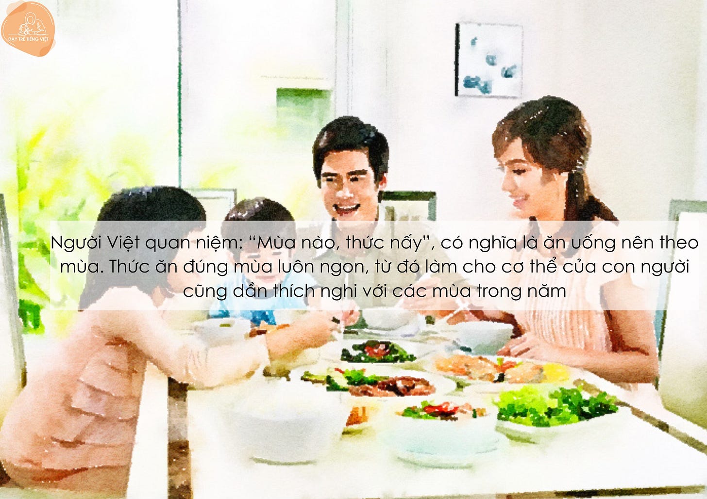 Người Việt quan niệm: “Mùa nào, thức nấy”, có nghĩa là ăn uống nên theo mùa. Thức ăn đúng mùa luôn ngon, từ đó làm cho cơ thể của con người cũng dần thích nghi với các mùa trong năm. Trải qua quá trình thích nghi với môi trường sinh thái, tự nhiên, người Việt ở mỗi vùng, mỗi địa phương đều đúc kết những kinh nghiệm trong ăn uống như vậy, và tổng hợp thành tri thức dân gian. Điều này chứng tỏ rằng con người đã làm chủ được tự nhiên, chứ không còn ở thế bị động, phụ thuộc hoàn toàn vào tự nhiên nữa. Thức ăn theo mùa hình thành thói quen ăn uống cũng như cách chế biến khác nhau theo từng mùa, chẳng hạn: Mùa hè nóng bức, người Việt thường ăn nhiều món ăn nhẹ giúp dễ tiêu hoá như cá, tôm, cua, rau củ quả...,hay chế biến những món có nước để dễ ăn và bổ dung nước cho cơ thể, chẳng hạn như các món canh ăn cùng với cơm, các loại bún với nước dùng...Sản vật cũng được lựa chọn theo mùa: Mùa hè cá sông, mùa đông cá biển.