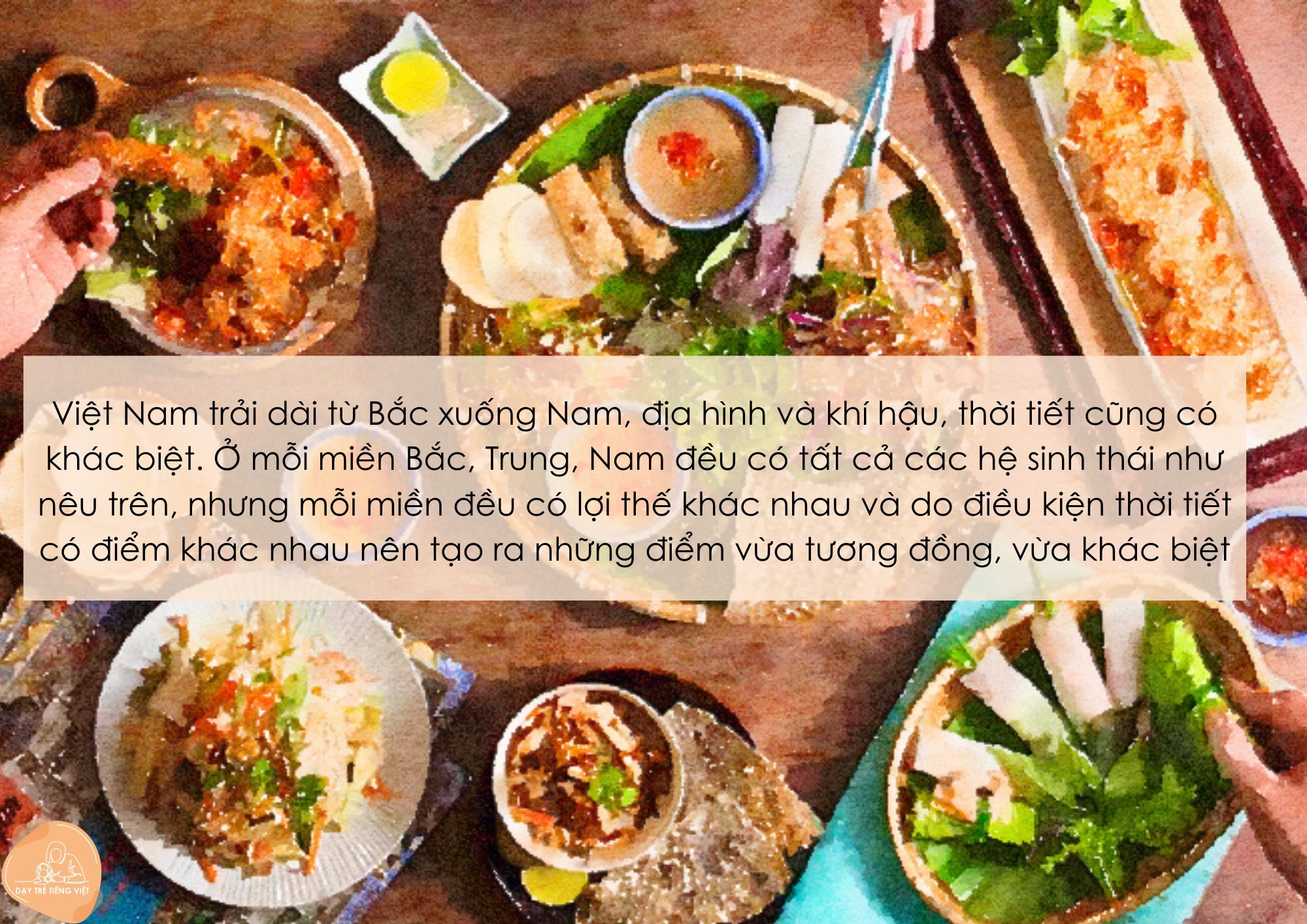 Việt Nam trải dài từ Bắc xuống Nam, địa hình và khí hậu, thời tiết cũng có khác biệt. Ở mỗi miền Bắc, Trung, Nam đều có tất cả các hệ sinh thái như nêu trên, nhưng mỗi miền đều có lợi thế khác nhau và do điều kiện thời tiết có điểm khác nhau nên tạo ra những điểm vừa tương đồng, vừa khác biệt: