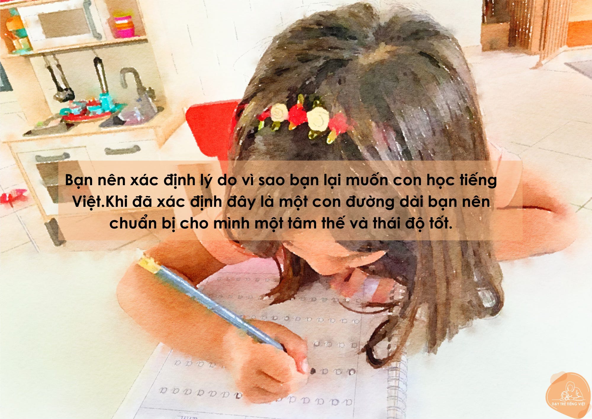 Khi đã xác định đây là một con đường dài bạn nên chuẩn bị cho mình một tâm thế và thái độ tốt. Bạn nên xác định lý do vì sao bạn lại muốn con học tiếng Việt. Câu hỏi này nghe có vẻ không khó nhưng khi suy nghĩ kỹ bạn sẽ thấy đây chính là mục tiêu để bạn đồng hành cùng con trên con đường học tiếng Việt. Bạn nên ghi ra giấy, cuốn sổ hoặc điện thoại những câu trả lời cho những câu hỏi dưới đây.