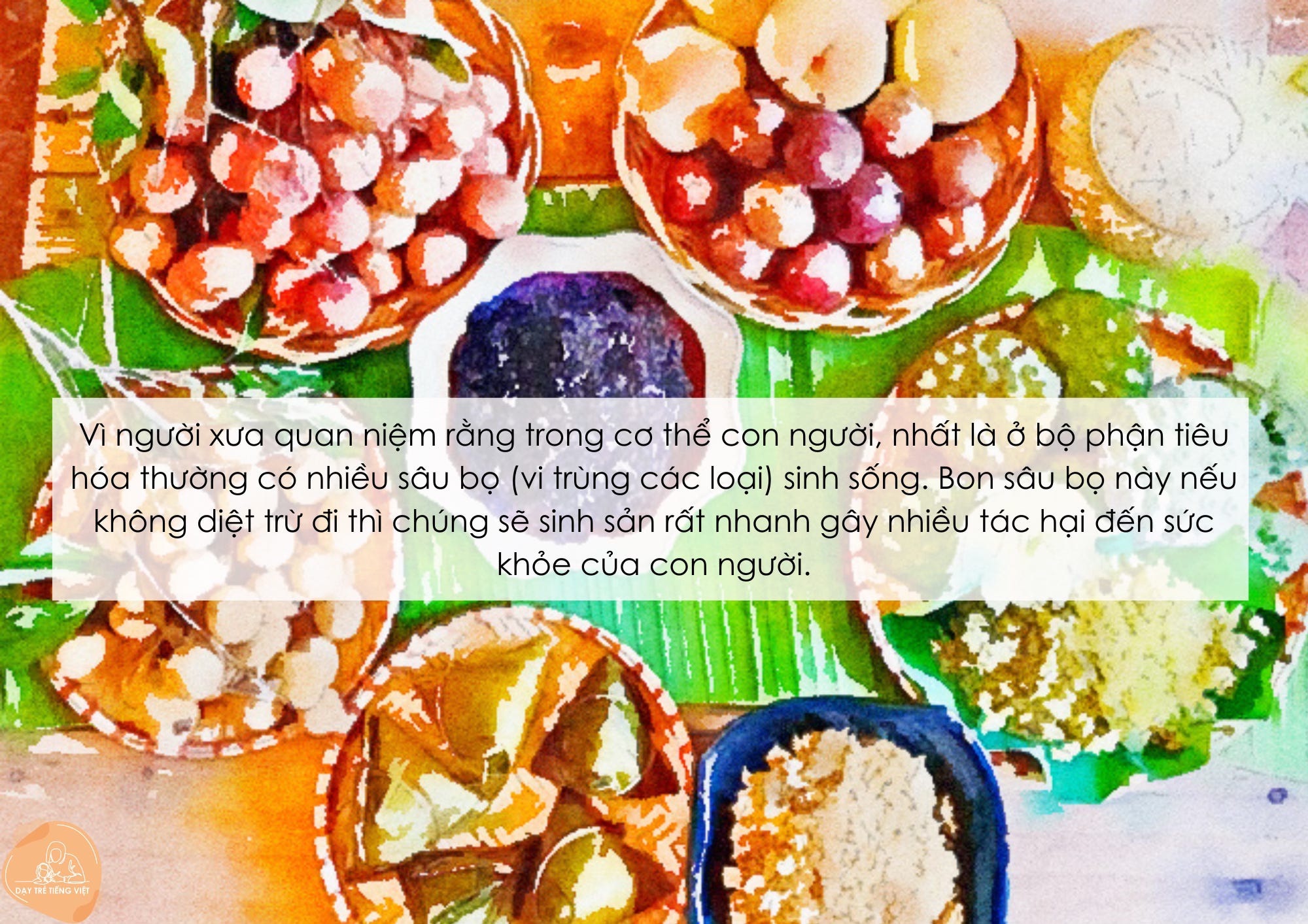 Từ chỗ quan niệm nôm na như vậy, đến sáng sớm ngày mùng 5 tháng 5 hàng năm người ta ăn rượu nếp và hoa quả để tiêu diệt sâu bọ. Người xưa còn giải thích rằng: Bọn sâu bọ ở bụng dưới người ta ngoi lên bụng trên, nên chúng ăn phải rượu nếp bị say mềm, rồi ăn phải những trái cây sẽ làm cho chúng bị chết hàng loạt. Theo nền y dược học dân gian cổ truyền, thì mỗi loại trái cây là một loại thuốc giết trừ sâu bọ. Còn đối với trẻ em, vào ngày hôm giết sâu bọ, người ta bôi cho trẻ một ít thần sa, chu sa vào hai bên thái dương và vào bụng nữa; hoặc có người còn hòa với nước cho trẻ uống.